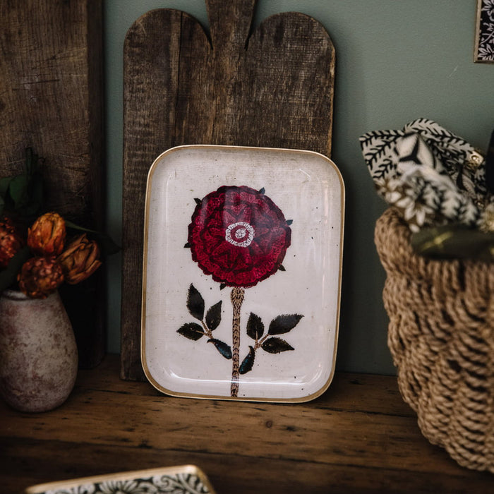 まるで古いキャンバスにエナメルを流し込んだようです。透明感があり美しいトレイです。
