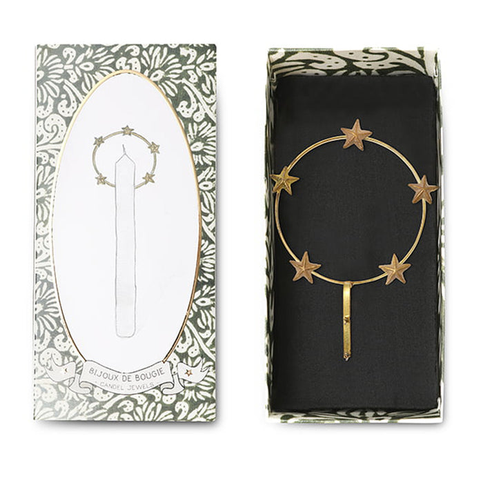 少し細めのキャンドル用です。キャンドルの後ろにつけ、点火する先端が輪の中央に来るようにします。小さな星が輪を描いて炎を囲む様子はとても美しいです。