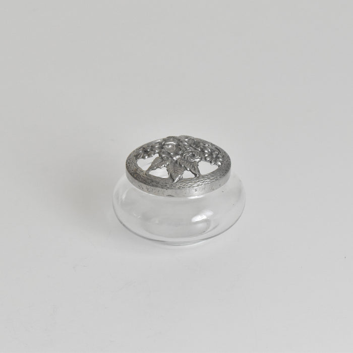 ピューター製の花模様の蓋と、透き通るガラスが相まった美しいポプリ入れです。
