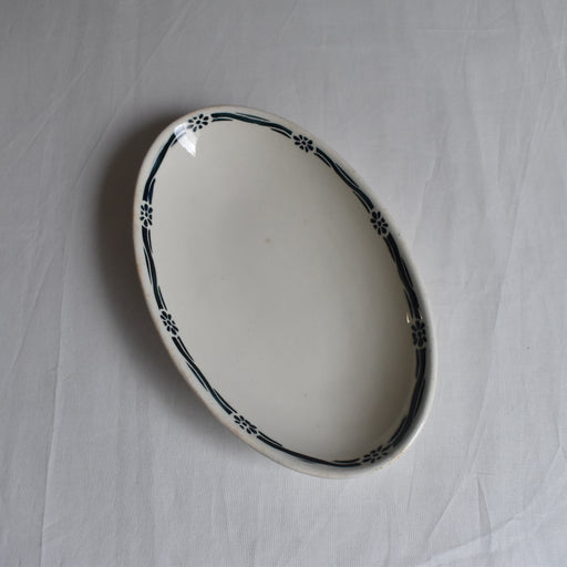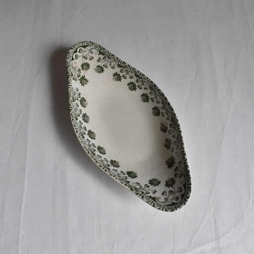 Brocante/蚤の市Badonviller窯 アンティーク ラヴィエEpinalシリーズです。 なめらかな曲線が魅力的なラヴィエ。シンプルなデザインが美しいです。 状態:裏の高台部分に欠けがございますが表に影響はしません。シミが少し見られます。 サイズ:22.5cm x 14cm x3.5cm 年代:20世紀初め