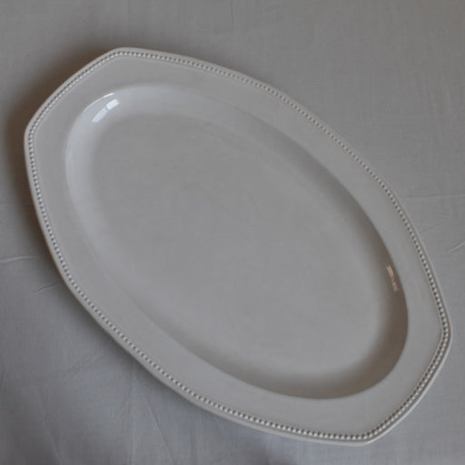 Brocante/蚤の市ヴィンテージのオーヴァル大皿 ロンシャン Perlesです。 パール状の縁飾りが上品で可憐な印象に仕上げています。柔らかく丸みを帯びた八角形が空間に適度な緊張感を生み、気品を感じさせます。真っ白な釉薬と貫入が美しく調和し、まルデ大理石のような風合いに。 ヴィンテージが生み出した美しさや面白さ...
