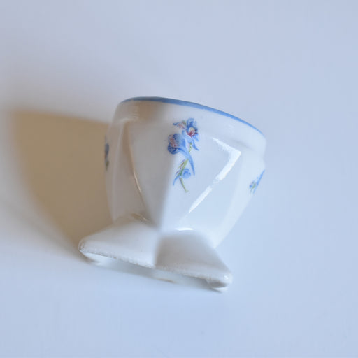 Brocante/蚤の市アンティークのエッグスタンドです。 シャープなデザインのスタンドに可愛らしい青色の花模様があしらわれています。 滑らかな卵の曲線がよく映える素敵なエッグスタンドです。 状態:目立った傷がなくいい状態です。 サイズ:4.5cm x 5.5cm x 高さ4.5cm 年代:不明