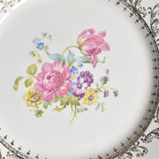 20世紀中期に作られたこの一枚は、温かみのある乳白色の肌に、繊細な金彩の縁取りと、生き生きとした花のプリントが美しく映えます。