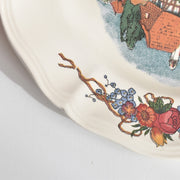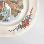 中央の絵柄を囲むように、縁には美しい花束やリボンの装飾が施された、華やかでコレクターにも人気の高い一枚です。