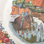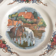 こちらのデザートプレートには、水辺で水を飲む、茶色と白の二頭の馬と、鞍に座って見守る人物が描かれた風景です。