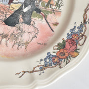 中央の絵柄を囲むように、縁には美しい花束やリボンの装飾が施された、華やかでコレクターにも人気の高い一枚です。