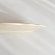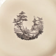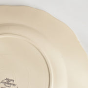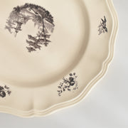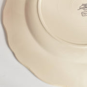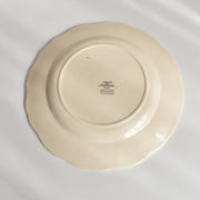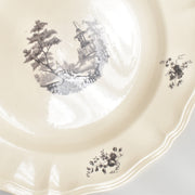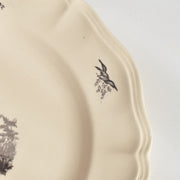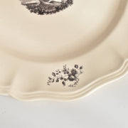 人気の花リム(フリル状の縁)が施された、温かみのあるクリームがかったアイボリー色の美しいプレートをベースに、シックな黒のトランスファー(転写)プリントが際立っています。