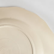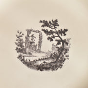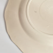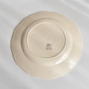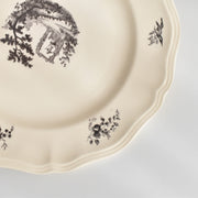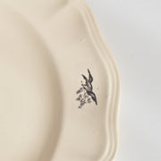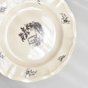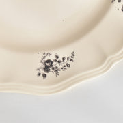 人気の花リム(フリル状の縁)が施された、温かみのあるクリームがかったアイボリー色の美しいプレートをベースに、シックな黒のトランスファー(転写)プリントが際立っています。