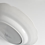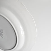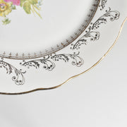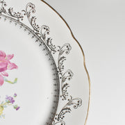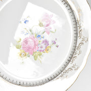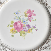 20世紀中期に作られたこの一枚は、温かみのある乳白色の肌に、繊細な金彩の縁取りと、生き生きとした花のプリントが美しく映えます。