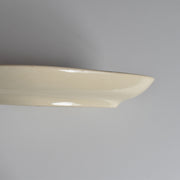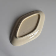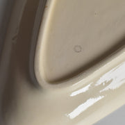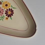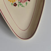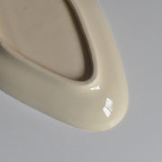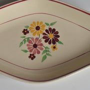 ひし形に近い楕円形のシェイプは、オードブルやフルーツ、お菓子などを盛り付けるのに便利な形状で、縁をぐるりと囲む赤のラインがデザイン全体を引き締めています。日々の食卓を明るく、楽しい雰囲気にしてくれる、ノスタルジックな魅力あふれる一品です。