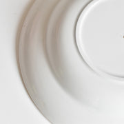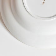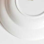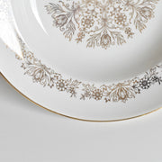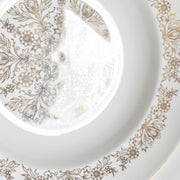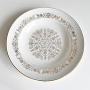 中央には見事な花柄のメダリオン、その周りには繊細な縁取りの模様、そして薄い金の縁。