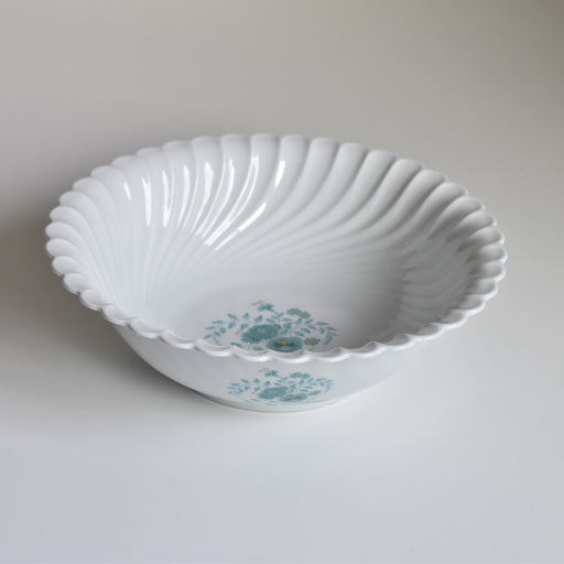 Brocante/蚤の市Limoges Haviland窯のヴィンテージサラダボウルです。 新雪のような汚れを知らない白が魅力的な一品。 風に柔らかに靡くカーテンのように美しいレリーフも特徴の一つです。 グリーンの花が可愛らしく咲いている様子もまた可愛らしいデザイン。 果物や包菓子をたっぷりと入れて、キッチン周りに飾...