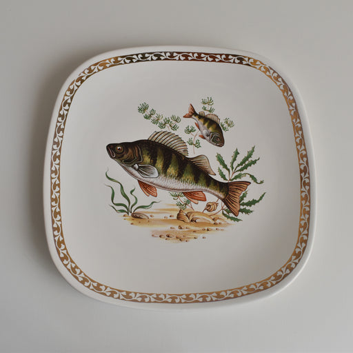 Brocante/蚤の市LONGCHAMP(ロンシャン)窯のpoisson シリーズです。 こちらの魚は、”Perche”パーチです。ヨーロッパでよく見かけられる淡水魚のパーチ。 美しく鮮やかな緑色の体が、本物そっくりに描かれています。 四角いプレートの縁には、水草や海藻柄の金彩が施され生き生きと描かれた魚を、美...