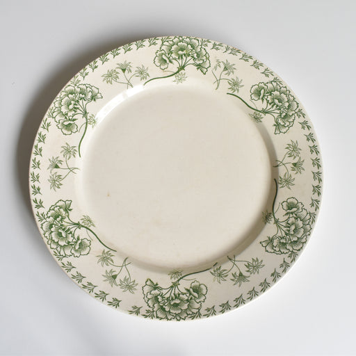 Brocante/蚤の市U&C Sarreguemines窯のアンティークプレート Palmyreシリーズです。 綺麗なグリーン色のトランスファーのお花のガーランドのデザインです。 状態:貫入が全体に広がっていてシミが見られます。欠けやひびはございません。 サイズ:直径23.5cm x高さ2.3cm 年...