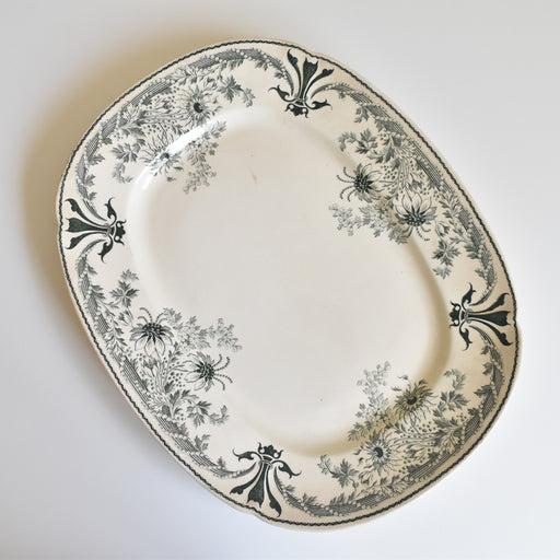 Brocante/蚤の市U&C Sarreguemines窯のアンティークのレクタングル大皿Molièreシリーズです。 深いグリーン色の花の模様と、レクタングルのフォルムが相まって、どこかモダンな印象もうけるシリーズ。 裏にはシミが広がり、アンティークの柔らかな風合いも楽しめる一品です。 レクタングルの大皿...