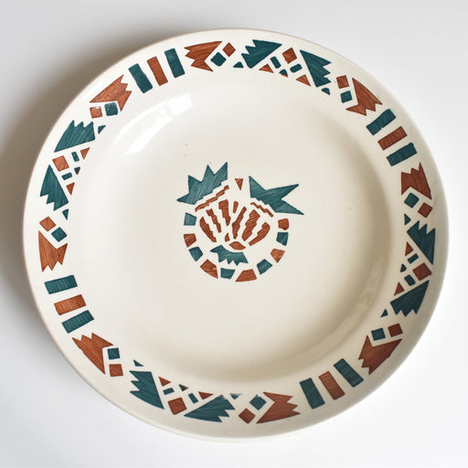 Brocante/蚤の市Longchamp窯のアンティーク深皿です。 オレンジ色に近い茶色と緑の2色のハンドペイントのステンシル。 アフリカの民族模様を彷彿とさせるデザインは、フランスの植民地の影響を感じさせます。 ステンシルの刷毛の筋が、より絵柄に躍動感を与えダイナミックな印象の深皿です。 状態:貫入やうらに製造の...