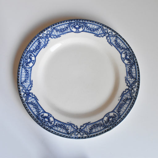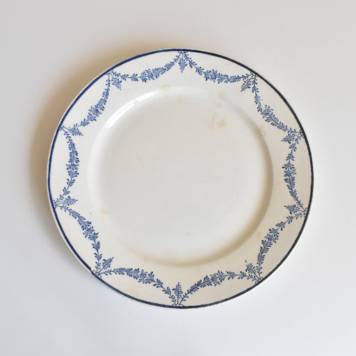 Brocante/蚤の市Salins窯のアンティークデザートプレートDirectoire(ディレクトワール)シリーズです。 ディレクトワール様式をイメージした濃いブルーの縁がホワイトのプレートによく合います。細やかなリボンやバラのガーランドが魅力的なシリーズ。 壁に飾っても素敵です。 状態:全体に貫入が見られます。少...