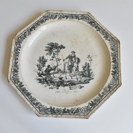 Brocante/蚤の市Creil(クレイユ)窯のアンティークオクトゴナルプレートです。 人気のオクトゴナルプレートです。見込みには盗賊に襲われているシーンが描かれブドウの蔦で縁取られたデザイン。 傷や着色など使用感たっぷりのお皿でアンティークの風合いをお楽しみいただけます。 インテリアとしてとても素敵です。 状態:...