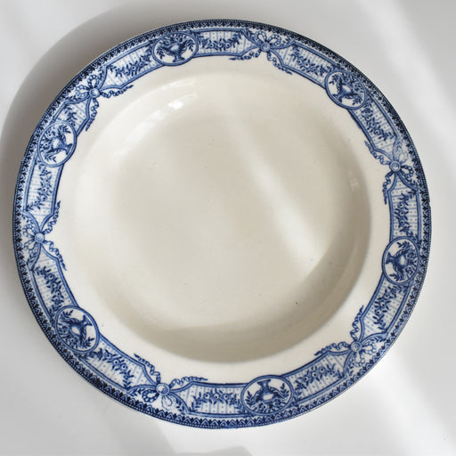 Brocante/蚤の市Salins窯のアンティーク深皿Directoire(ディレクトワール)シリーズです。 ディレクトワール様式をイメージした濃いブルーの縁がホワイトのプレートによく合います。細やかなリボンやバラのガーランドが魅力的なシリーズ。 壁に飾っても素敵です。 状態:全体に貫入が見られ使用感も少し感じられ...