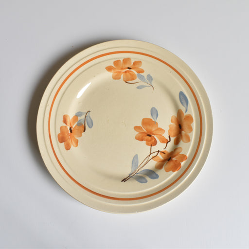 Saint Amant窯のヴィンテージデザートプレートです。 クリーム色のお皿に手書きでデザインされているオレンジ色の花が魅力的です。 状態:全体に貫入が広がっています。目立ちませんが1mm程度の欠けが縁にございます。 また製造上にできた凸凹などが見られますがいい状態です。 サイズ:直径19....