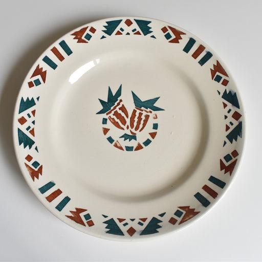Brocante/蚤の市Longchamp窯のアンティークプレートです。 オレンジ色に近い茶色と緑の2色のハンドペイントのステンシル。アフリカの民族模様を彷彿とさせるデザインは、フランスの植民地の影響を感じさせます。 ステンシルの刷毛の筋が、より絵柄に躍動感を与えダイナミックな印象のアンティークプレートです。 状態...