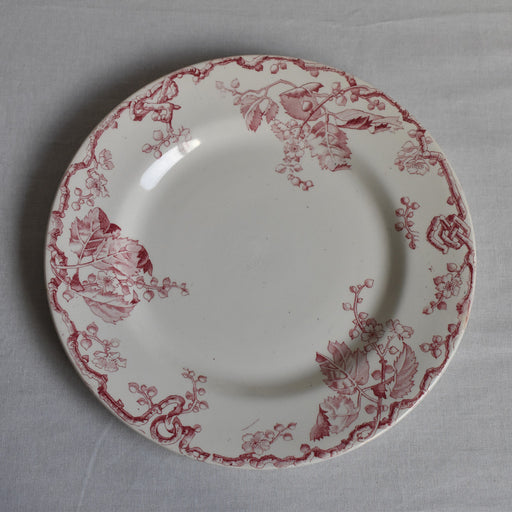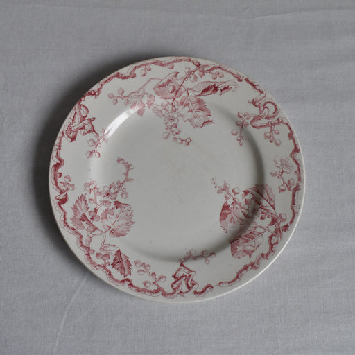 Brocante/蚤の市ムラン・デ・ルーのデザートプレートです。 深く熟したワインのような赤色が目を引きます。描かれた花は、茎や蕾ととも美しくプレートに混ざり合っています。 ダイナミックなデザインですが、落ち着いた色のため上品です。 使い勝手のいいサイズも嬉しいポイントです。 少し使用感ございます(カトラリーの跡)が...