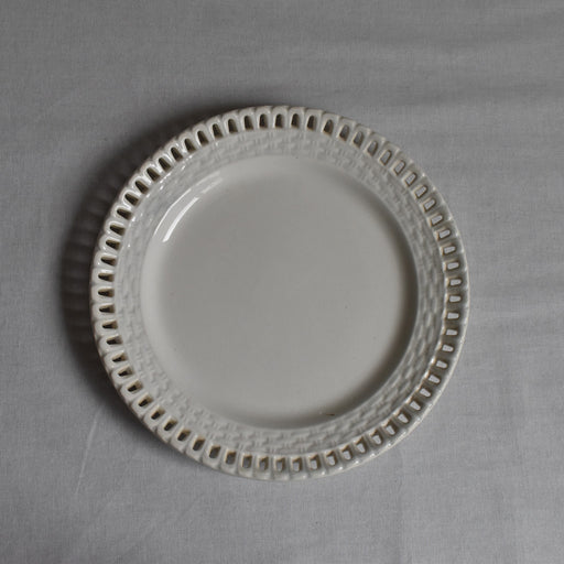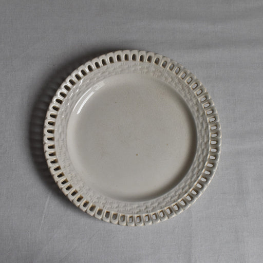 Brocante/蚤の市U&Cサルグミンヌ のデザートプレート です。 1850年頃のものです。オープンワークのリムにパニエ模様があり、可愛らしいレースとカゴが合わさったような可憐なデザインです。 シンプルな色ですが、縁取りの美しさが載せたものをより映えさせさす。 プレートの表には、作られた時にできた傷、小さ...