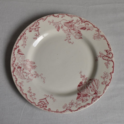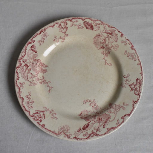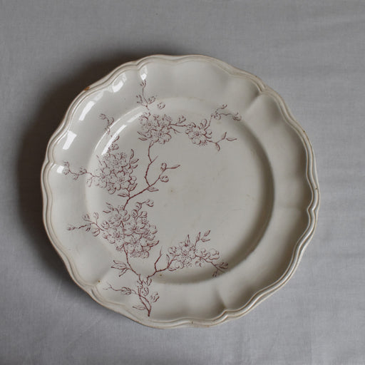 Brocante/蚤の市花や蕾が縁を飾り、とても美しいデザインです。 自然な植物の姿のようで、蔦が幾何学模様のような編み込まれているなど作り手の遊び心も感じられます。 欠けやヒビがなく状態のいいプレートになります。 カトラリー跡は少し見られます。 貫入あります。 サイズ:20cm x 1.5cm 年代:19世紀...
