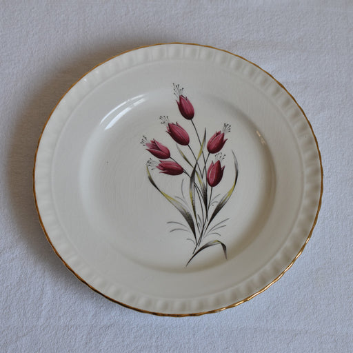 Brocante/蚤の市ジアンのヴィンテージデザートプレート です。 シリーズは不明ですが、花はチュリップと思われます。金の縁がついていて可愛らしいプレート になります。 使用感は少なく状態がとてもいいです。 貫入はあります。 サイズ:20.5cm x 2.5cm 年代:1960〜1980年