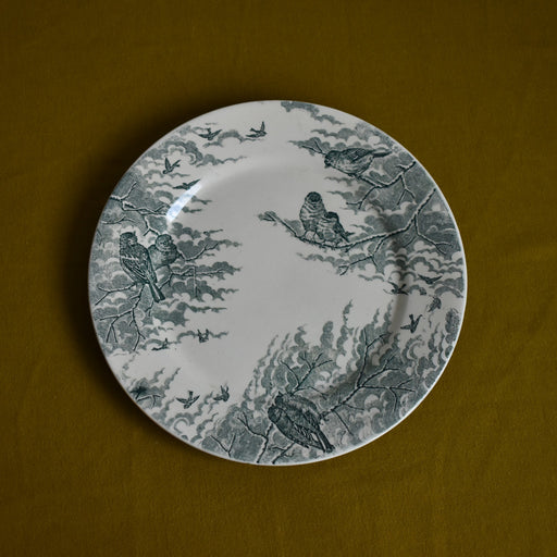 Brocante/蚤の市U&C サルグミンヌのデザートプレートです。 雪の積もる枝に、つがいの小鳥が3組もいるデザイン。可愛らしさの中に愛や温もりが伝わってきます。 遠くには自由に飛び回る小鳥たちも描かれ、フラットなプレートに奥行きを感じます。小鳥のさえずりを想像したり、周りの風景を思い浮かべたりしながら...