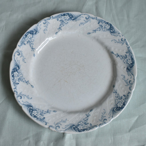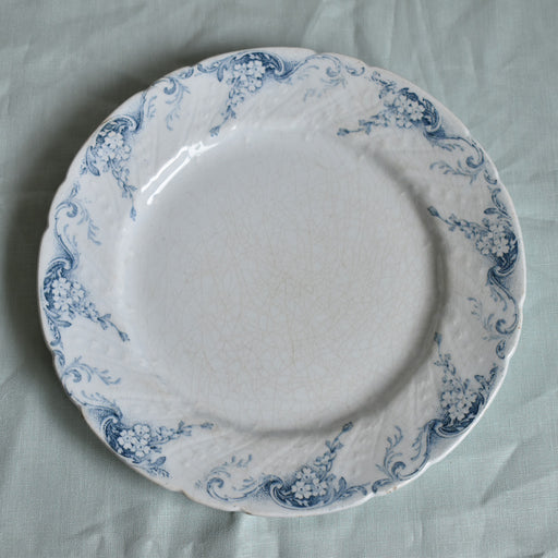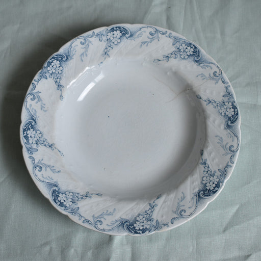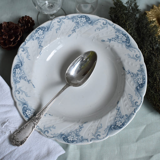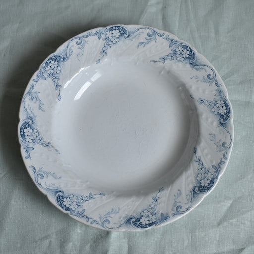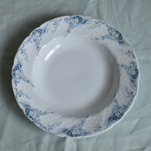 Brocante/蚤の市K&GリュネヴィルのANGELE(アンジェル)コレクションの深皿 です。 花のつぼみや葉のような立体的なモチーフと、草花のプリントが美しく調和した、上品でエレガントなプレートです。 美しく描かれた縁取りは、落ち着いた青色。 20世紀初めのデザインだと考えています。 カトラリーの跡やシミなど...