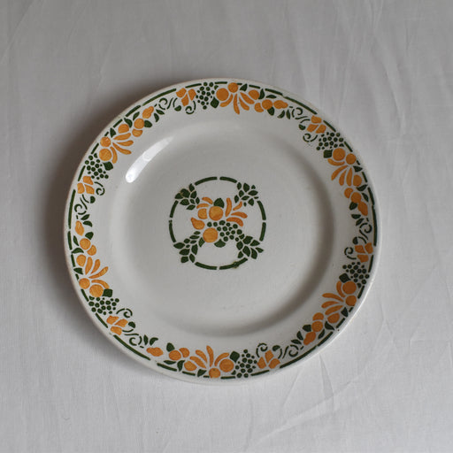 ヴィンテージデザートプレート HBCM (クレイユモントロー) Bizerteシリーズです。 ビタミンカラーが目を引くヴィンテージプレート。 ステンシルで描かれた果実は、南フランスを彷彿とさせるフレッシュなデザイン。 ステンシル2色 状態:貫入や全体的にシミがあり、ヴィンテージの柔らかな風合...