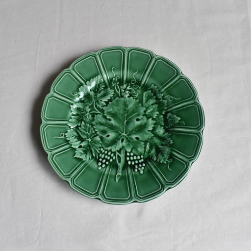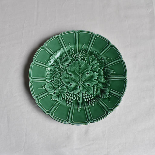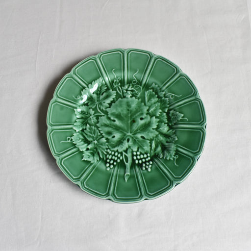 Brocante/蚤の市サルグミンヌ窯のアンティークバルボティーヌのデザートプレートです。 流し込み成形で作られた美しく細やかなレリーフ。 葡萄の葉から実が覗き、とても立体的。釉薬の流れ込み具合で色の濃淡が異なり、深みを増します。 絵皿として楽しみたくなるような素敵なプレートです。 状態:全体に貫入が広がっていますが...