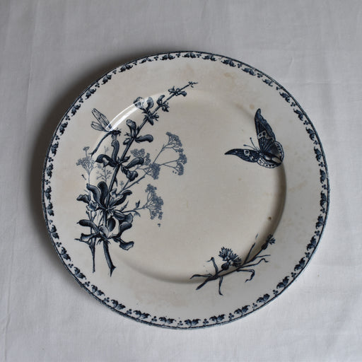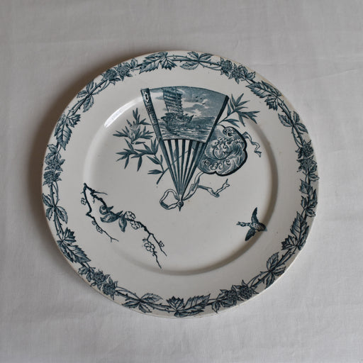 Brocante/蚤の市Pexonne釜のアンティークプレートEventail シリーズです。 ジャポニズムを感じる扇子や梅の絵柄。縁の部分にはベリーの蔦が取り囲むなど、絵柄の組み合わせが面白い一品です。 状態:多少のカトラリー跡や貫入、シミが見られます。 サイズ:直径22.5 x 高さ2cm 年代:19世紀終わりと...