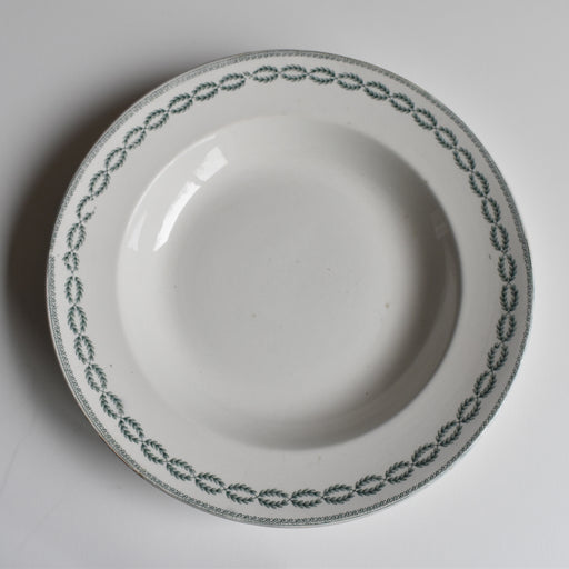 Brocante/蚤の市U&C Sarreguemines窯のアンティーク深皿Nobilisシリーズです。 月桂樹のリースが縁を彩里、気品を感じるデザイン。 真っ白なプレートに爽やかな緑がよく映えます。 上品で落ち着いた雰囲気の深皿です。 状態:縁に擦れが見られ、カトラリー跡が確認できます。貫入や小さな突起、...