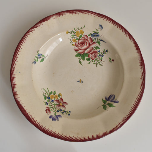 Brocante/蚤の市FF Pexonne窯のアンティーク深皿Saxeシリーズです。 トランスファーの下地に、ハンドペイントで色が載せられ、生き生きとした表情を楽しめるアンティーク深皿。 細やかな貫入が広がり、アンティークの柔らかで温もりある風合いが素敵です。 状態:カトラリー跡や貫入が見られます。全体的に変...