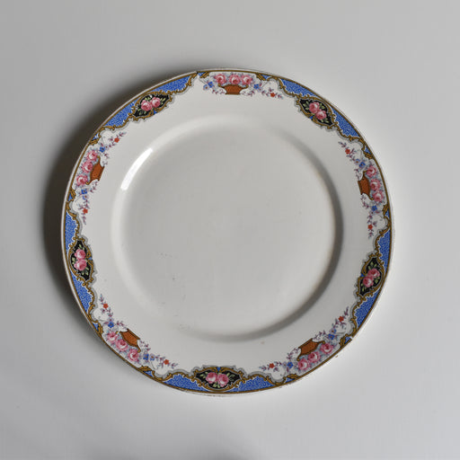 Digoin&Sarreguemines窯のヴィンテージデザートプレートです。 キリッとした絵柄が美しく、エレガントな雰囲気。 ブルーとピンクの色合いも素敵です。 状態:カトラリー跡やシミが見られます。 サイズ:直径20.5cm 高さ1.5cm 年代:1920~1950年