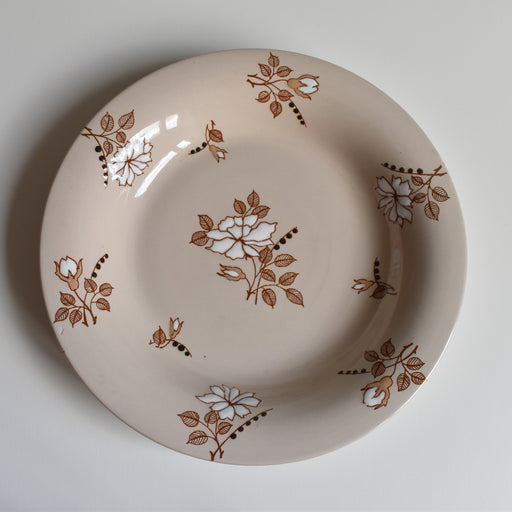 Longwy窯のヴィンテージ深皿Pragueシリーズです。 ステンシルの花模様が可愛らしい深皿。 茶色がかったオレンジ色は、色の濃淡が楽しめます。 状態:カトラリー跡や貫入、シミがありますが、かけやひびはありません。 サイズ:直径22cm x 高さ3㎝ 年代:20世紀中期