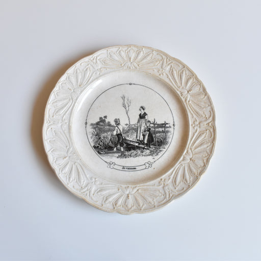 FF Pexonne窯の絵皿Juinです。 一年の月を絵皿にしたコレクションです。こちらは6月。 細やかな貫入が広がり、アンティークの柔らかな風合いをたっぷりとお楽しみいただける一品です。 季節感のある絵柄の人々の服装やしぐさ、風景。 少女が嬉しそうに白鳥に餌をあげています。 その時々の季節や...