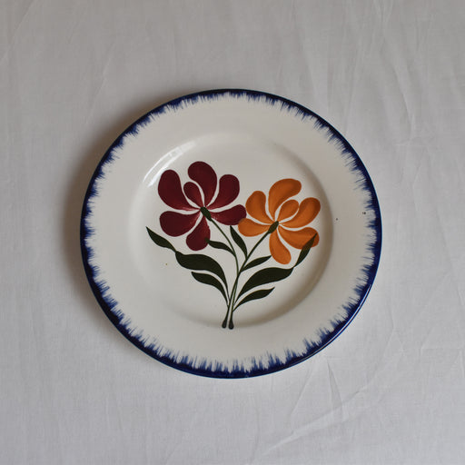職人が一枚一枚絵付けした絵皿。表情豊かな花々と縁取りのブルーが素朴で自然な美しさを感じさせます。また、色の変化や絵筆の動きを感じられる魅力がいっぱいのプレートです。 ポストカードを飾るように、壁に飾っても素敵です。 アンティークですが、目立った傷もなく綺麗な状態です。   裏の刻印につ...