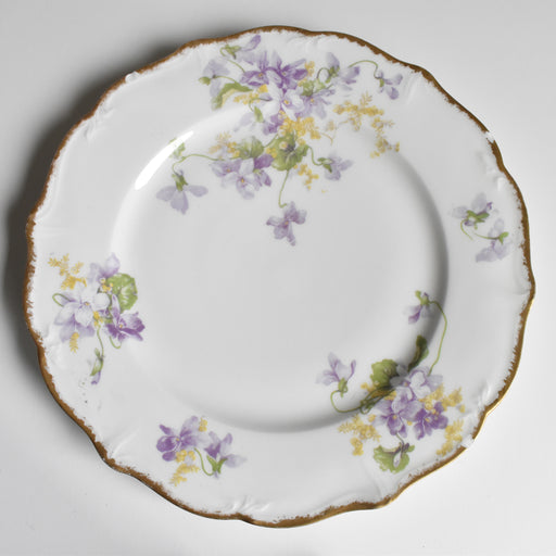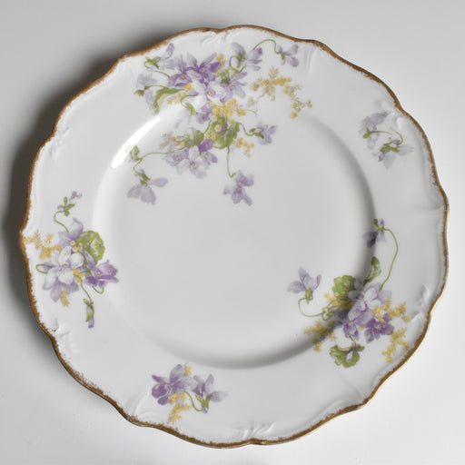 Brocante/蚤の市Charles Ahrenfeldtのリモージュ窯がエミールブルジョワ用に作られたアンティークデザートプレートです。 金彩とレリーフのあるリムにスミレや黄色いミモザのような花が描かれたいます。 両方のバックスタンプも付いていてとても素敵なお皿です。 状態:プリントと金彩が薄くなっていますが...
