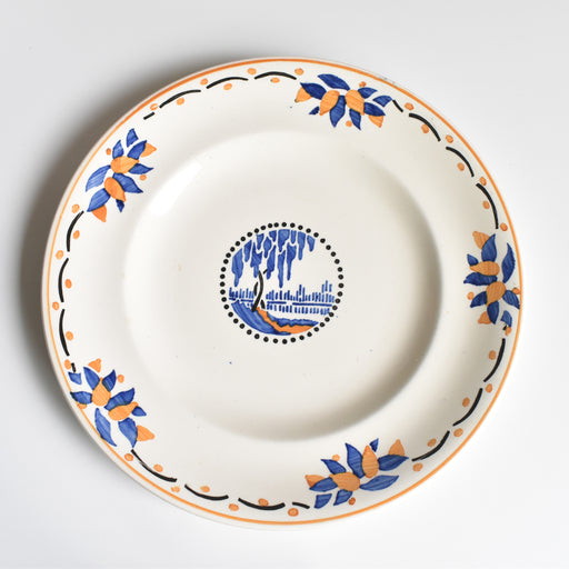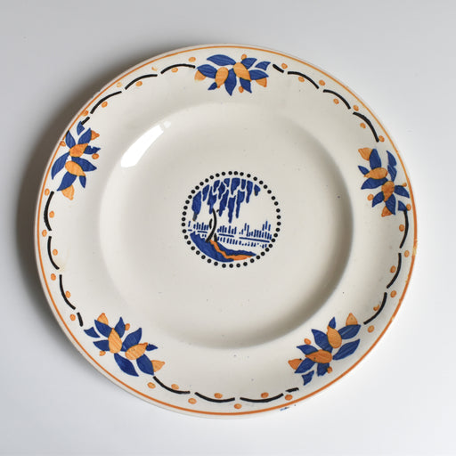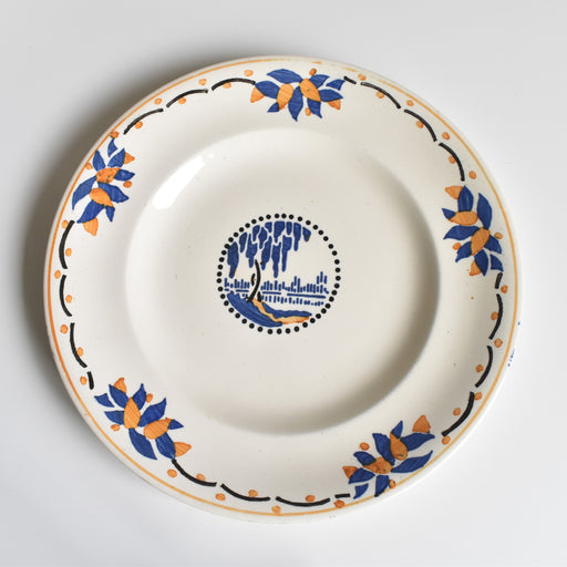 Brocante/蚤の市Longwy窯のアンティークプレート Trianonシリーズです。 18世紀から存在しているロンウイ窯のプレートです。 青、黒、オレンジの手書きのステンシルで装飾されています。 真ん中のメダリオンは川のそばに枝垂れ柳を描かれていて印象派の影響を感じさせてどこか懐かしい印象を与えてくれます。 ...