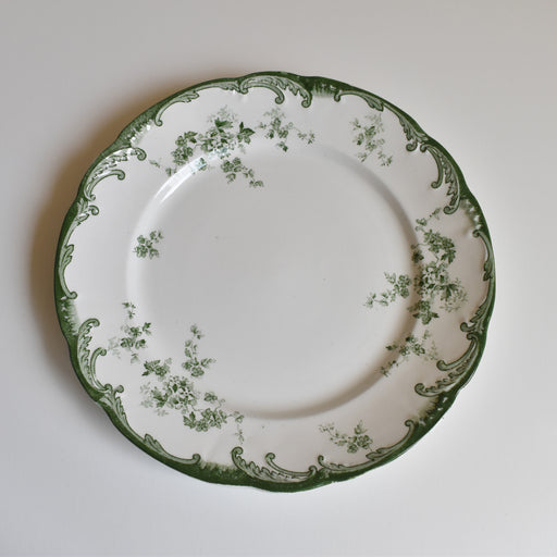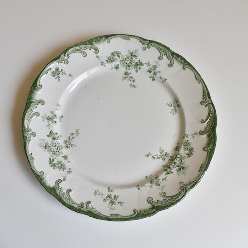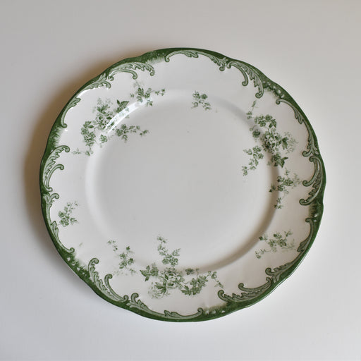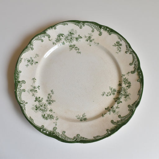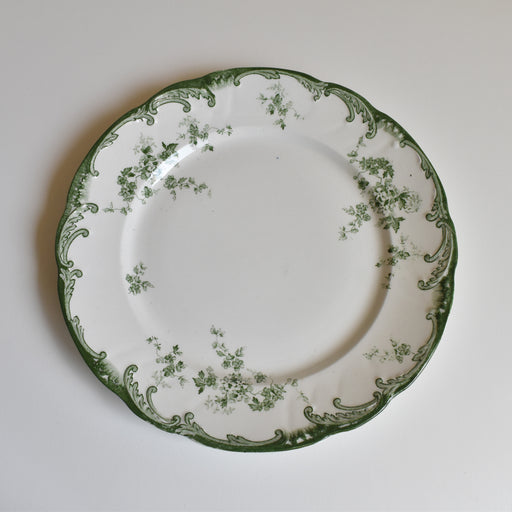 Brocante/蚤の市イギリスRidgways窯のアンティークプレート Chiswickシリーズです。 半磁器のプレートに緑色の花柄トランスファーと縁にレリーフが施された、豪華なお皿です。 美しいレリーフと鮮やかな緑色の花柄トランスファーが、素敵なデザインを作り出すことでおしゃれな雰囲気を演出します。 こちらの...