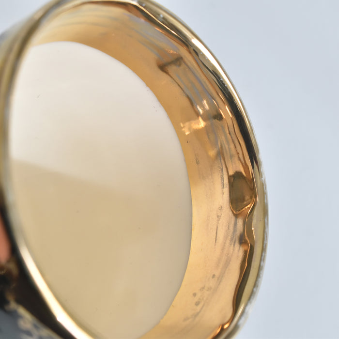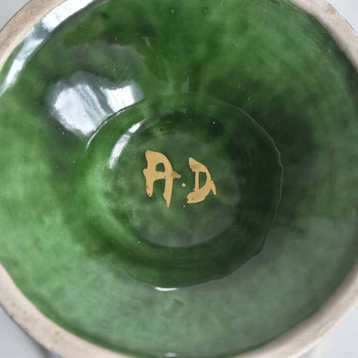 A.Dressinval 1954年から1976年まで、フランス・ブルゴーニュ地方で釜を持っていた陶芸家です。 全て手作業で作られ、作家の息遣いが感じられる細やかな金の装飾が魅力的です。 小さな丸い模様が、ブルゴーニュ地方のぶどう畑を連想させます。