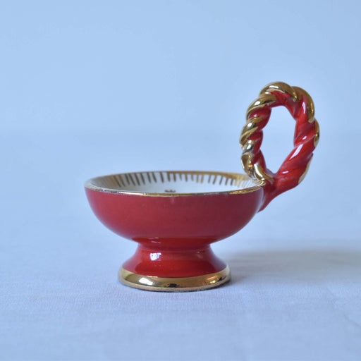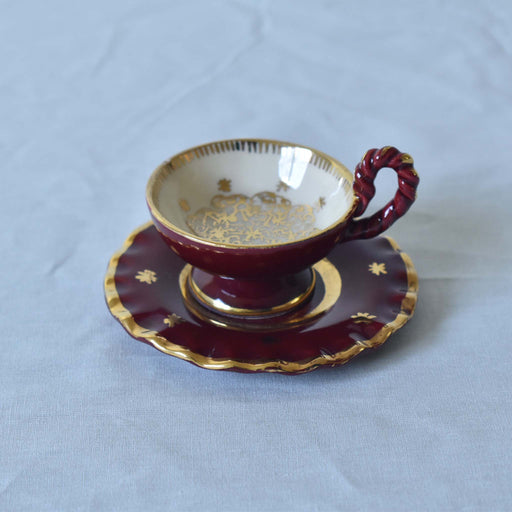 Brocante/蚤の市A.Dressinval70年代のミニカップアンドソーサーです。 絵は全て手書き 色はレッド手書きの柄はゴールド(金)小さな欠けなどございますのでご注意ください。 サイズ ソーサー 10cmx1.5cm カップ 直径7cm x 高さ4cm(取っ手含めて8.5cmx高さ7cm) 撮影時の光加...