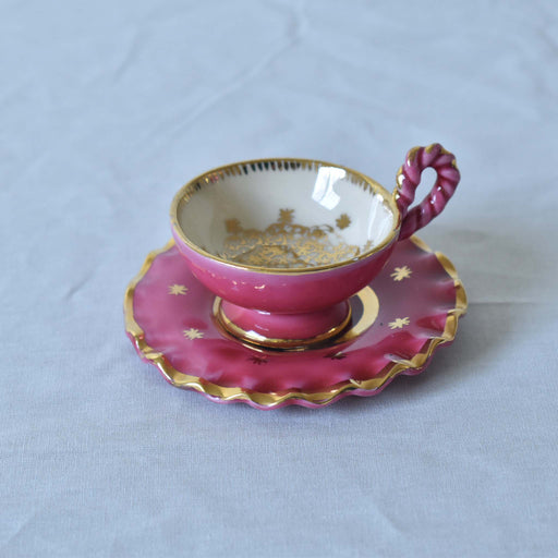 Brocante/蚤の市A.Dressinval70年代のミニカップアンドソーサーです。 絵は全て手書き 色はピンク手書きの柄はゴールド(金)小さな欠けなどございますのでご注意ください。 サイズ ソーサー 9.5cmx1cm カップ 直径6.2cm x 高さ3cm(取っ手含めて8cmx高さ5cm) 撮影時の光加減...