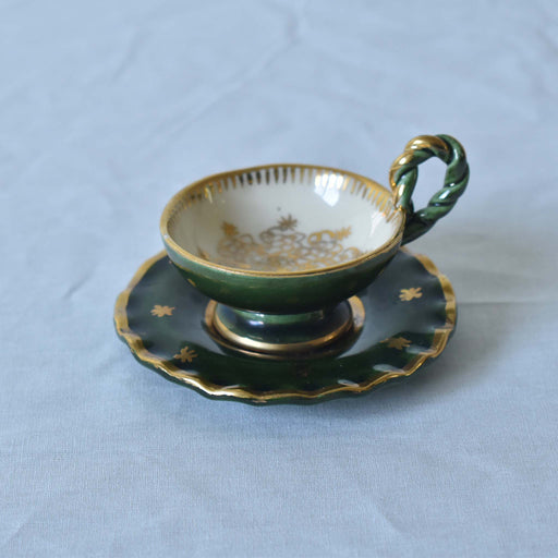 Brocante/蚤の市A.Dressinval70年代のミニカップアンドソーサーです。 絵は全て手書き 色はダークグリーン手書きの柄はゴールド(金) 小さな欠けはございますのでご注意ください。 サイズ ソーサー 9.5cmx1cm カップ 直径6.5cm x 高さ3cm(取っ手含めて8.5cmx高さ5cm) 撮...