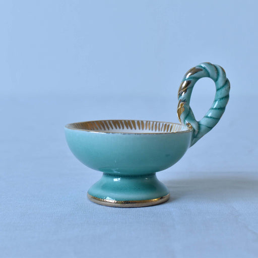 Brocante/蚤の市A.Dressinval70年代のミニカップです 絵は全て手書き色はターコイズ手書きの柄はゴールド(金)小さな欠けはございますのでご注意ください。サイズ 直径6.5cmx高さ4cm(取っ手含めて8.5cmx高さ7cm)撮影時の光加減により、画像と実物の色が異なる場合があります。また、ヴィンテー...