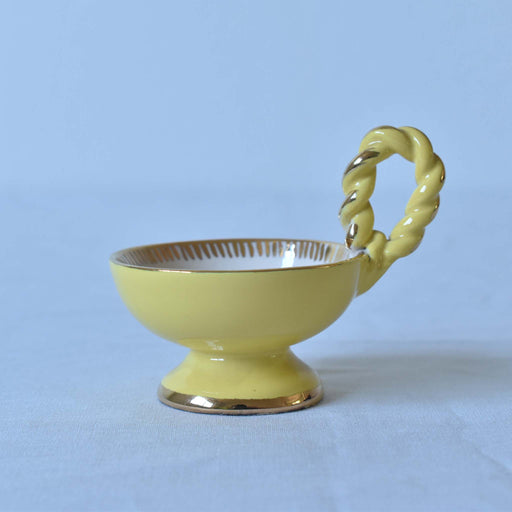 Brocante/蚤の市A.Dressinval70年代のミニカップアンドソーサーです。 絵は全て手書き 色はイェロー手書きの柄はゴールド(金)小さな欠けなどございますのでご注意ください。 サイズ ソーサー 10cmx1.5cm カップ 直径7cm x 高さ4cm(取っ手含めて8.5cmx高さ7cm) 撮影時の光加減...