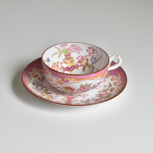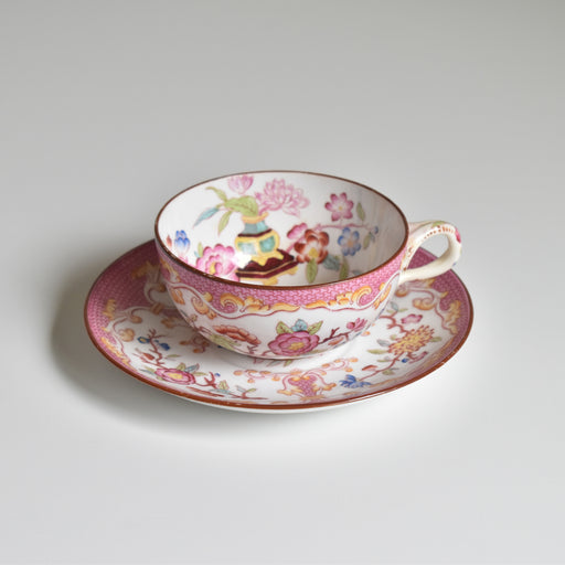 Brocante/蚤の市Sarreguemines窯のアンティークティーカップアンドソーサー Minton柄235番です。 鮮やかな色使いで描かれた花模様。トランスファーの上からハンドペイントで色が載せられ、きめ細やかな手仕事を感じます。 「中国の花瓶」と呼ばれる絵柄。中央には脚付きの盆に花が載せられたデザインが描...